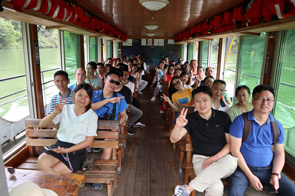 观赏完瑶寨风情后,大家又登上了湟川三峡的游船。沿着风光旖旎的连江逆流而上,两岸削壁垂河、青山浮影、郁郁葱葱、怪石嶙峋。江风习习,扑面而来,令人心旷神怡,大家不禁欢呼雀跃,欢笑声不绝于耳。