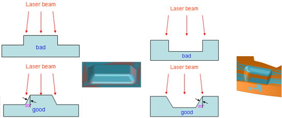 ①镭射区域不能设计垂直面,要适当的设计斜坡,斜坡与垂直线的角度应大于等于30°以上。(如图三)