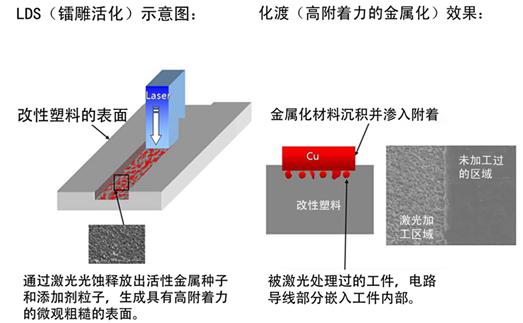 LDS材料是一种内含有机金属复合物的改性塑料,经过激光照射后,使有机金属复合物释放出粒子。