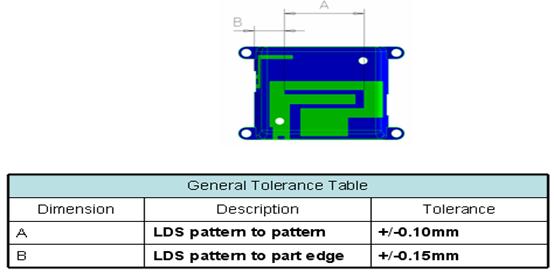 ⑨ LDS尺寸公差,一般情况,线路与线路之间为± 0.1mm,线路到塑胶壳边缘为±0.15mm。(如图六)