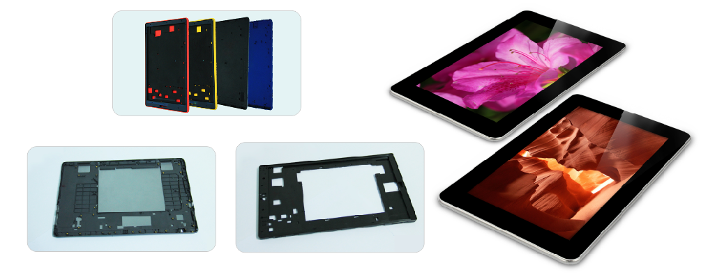 适用于各类高要求平板电脑的前壳、中壳、模内镶五金成型和后壳等。