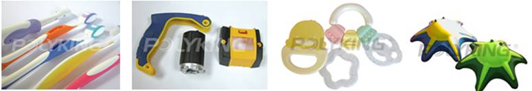 具有柔软之触感、优良之止滑性,耐候性,硬度泛围:shore 35A- shore 95A,注塑成型,广泛用于与ABS、PC、PA、PBT、POM等二次射出接着。如:电动工具、园林工具,等各种类握把,通讯玩具,电子电器等各种类外壳包边。 |