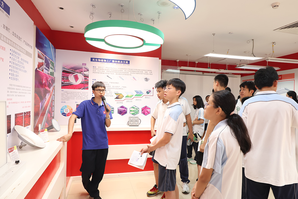 在LED展厅,讲解员老师以“光的进化史”展开,从火把、白炽灯到现代LED照明,学生们了解到人类照明技术的变革,还目睹了LED在农业、医疗、通信等领域的广泛应用演示。